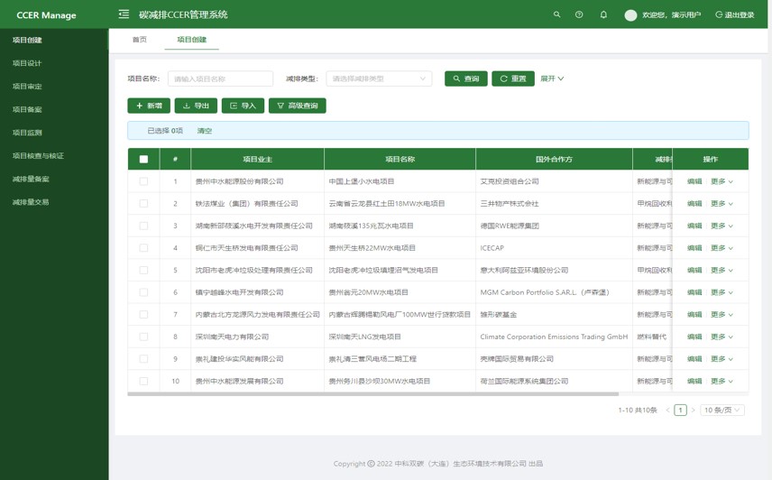 碳减排CCER管理系统,实现CCER开发设计、核查、备案、签发等全过程。